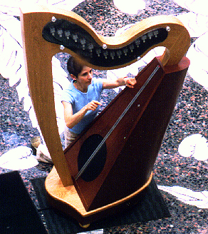 Stephanie Bennett premieres the Laser Harp at performance presented by Discovery Center for Science and Technology and Baxter BioScience, June 2, 2004, Westlake Village, California. The devices at the top of the harp (inside the clear panel) emit laser beams. When the beam is interrupted by the harpist's fingers, a synthesizer is triggered. The harp is built by Cosi Studios. Stephanie Bennett practices on the Laser Harp prior to performance. |