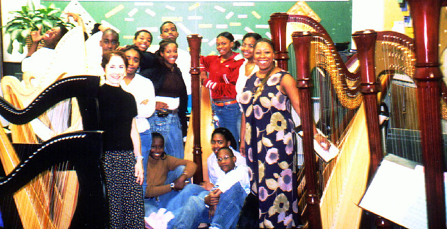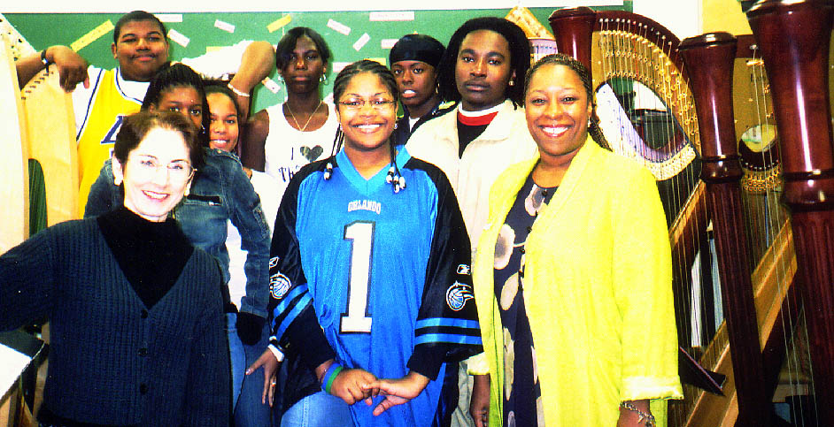 Stephanie Bennett (in black sweater) is guest instructor at harp class of Robbin Gordon-Cartier (in flowered dress) at Cicely Tyson School of Performing Arts, East Orange, New Jersey, October 17, 2005. |